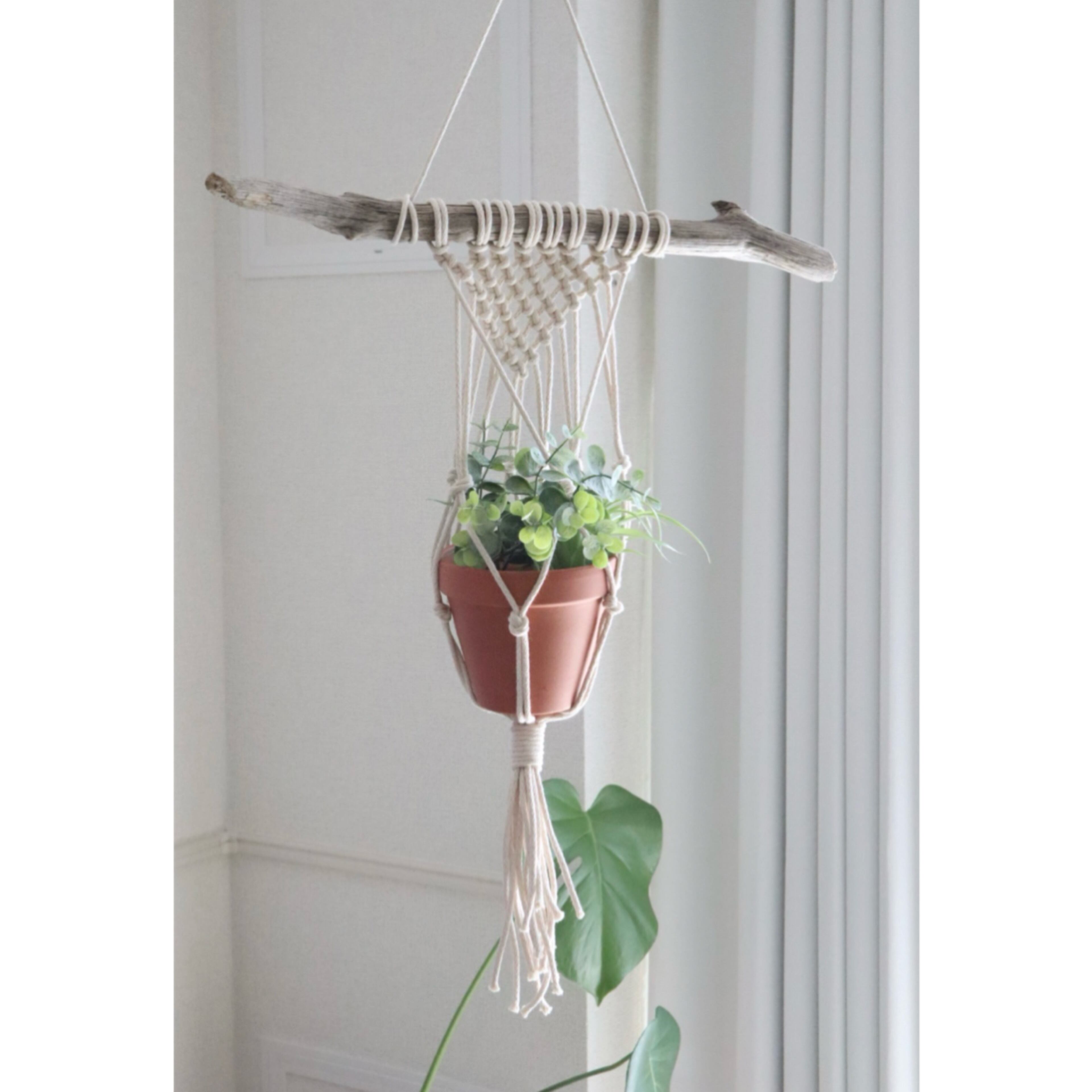 ナチュラルな流木とマクラメ編みで仕上げた、優しい雰囲気のプラントハンギング。